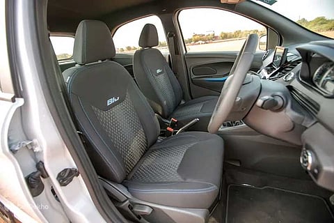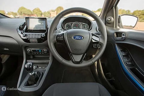New all-black upholstery with blue stitching on the Titanium Blu variant lends some sportiness to the interiors of the 2019 Figo. It also has blue accents along the door handles and blue needles for the instrument cluster dials.