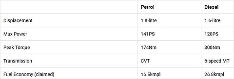 The petrol variant is only available with a CVT, while the diesel only gets a manual gearbox.