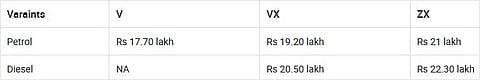 Price - Rs 21 lakh (Petrol)/ Rs 22.30 lakh (Diesel) (both ex-showroom India)