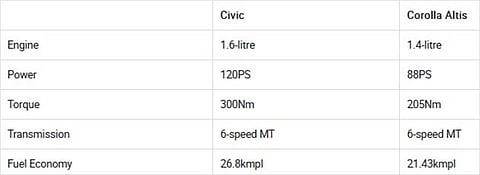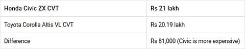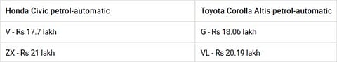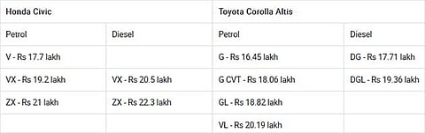 The tenth-gen Civic has been introduced in India and rekindles its rivalry another popular Japanese mid-size sedan, the Toyota Corolla Altis, which is the best-selling car in its segment. Honda offers the Civic in three varians - V, VX and ZX - with prices ranging from Rs 17.7 lakh to Rs 22.3 lakh (ex-showroom, India).