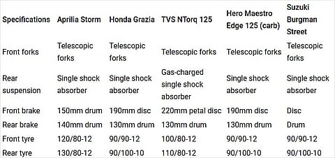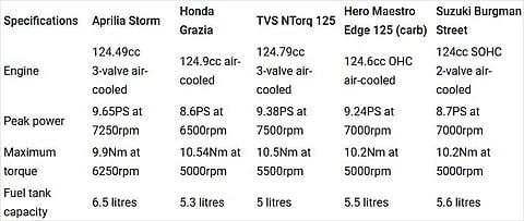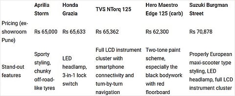 In a bid to further lower the entry point to own a sporty Aprilia scooter, the Italian brand has launched the Storm 125 in the country. It is priced at Rs 65,000 (ex-showroom Pune) and goes up against the Honda Grazia, TVS NTorq 125, Hero Maestro Edge 125 and Suzuki Burgman Street. Here’s how it performs against its rivals in terms of specifications: