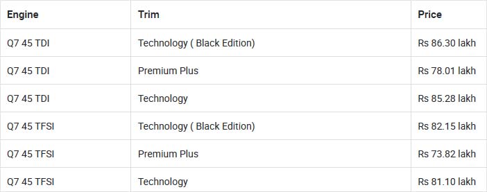 Audi has introduced the Q7 Black Edition in India at a price of Rs 82.15 lakh for the 45 TFSI and Rs 86.30 lakh for the 45 TDI (ex-showroom) variants. The diesel and petrol variants of the Q7 Black Edition command a premium of Rs 1.02 lakh to Rs 1.05 lakh over the Technology variant. Only 100 units of the Black Edition will be available in India to add to its exclusivity. This variant replaces the previously available Q7 Design Edition. Let’s take a look at its pricing now.