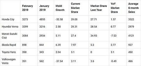 Top losers in February 2019: It’s interesting to note that the two month-on-month losers, the Honda City and VW Vento, are stacked at the extreme ends of the sales chart. The year-on-year share of every car grew except for the Vento and the Ciaz. The VW is awaiting an update for long and we can expect a new generation to come in a couple of years. Top gainers in February 2019: While the gains weren’t much in the segment, it was the Skoda Rapid that received the highest month-on-month demand, followed by the Ciaz facelift. As far as year-on-year demand increase is concerned, it was again the Skoda that stood out. The Czech carmaker introduced the Rapid Monte Carlo edition in February and started to offer 6-years warranty on the Rapid in March.