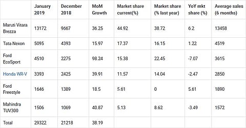 The demand for sub-compact SUVs seems to be going up again in the new year. It saw a month-on-month growth of 38 per cent in January 2019 over December 2018. Leading the charts is still the Maruti Vitara Brezza, while the Ford EcoSport made a return to form, but still trails behind the Tata Nexon, at the third spot.