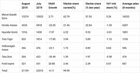 Dzire and Ford Aspire are the only cars to see a positive growth in their MoM figures.