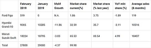 Overall decline: Nearly every automotive segment in the Indian market saw a decline in month-on-month demand for February 2019 and midsize hatchbacks were no exception. The segment saw an overall decline of -4.37 per cent in month-on-month growth.