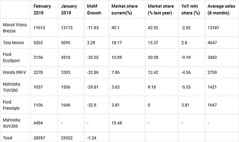 Maruti Brezza’s Dominance continues: Despite a MoM decline of around 12 per cent, the Brezza remains the most popular car in the segment. While there is no specific reason behind the drop in Brezza’s sales, it could be due to the introduction of the XUV300, which has done fairly well in its first month. Notably, despite the introduction of a new model, the overall sales of the segment were down in Feb compared to Jan 2019.