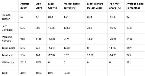 Jeep Compass and Hyundai Tucson were the only other cars to register positive month-on-month sales.