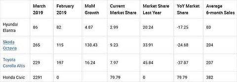 Skoda Octavia and Toyota Corolla Altis continue to swap places, but it’s the former that finished second in March.