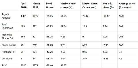 Fortuner sold nearly 500 units lesser than it did in March 2019.