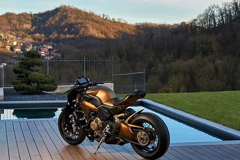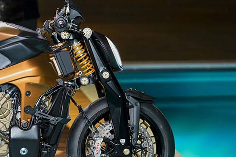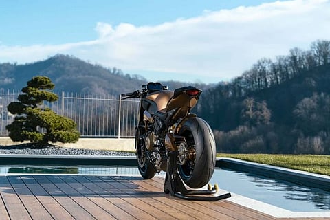 Called the 'V4 Penta,' it is essentially a stripped-down version of the Panigale V4. But doesn't it look like another famous naked Ducati bike? Well, that's for a good reason. The motorcycle trades in its full fairing and front headlamp assembly for the one found on the Ducati Diavel. While all the fancy electronic bits are expected to be carried over to keep things safe and modern, there are a few old-school touches too. The aluminium girder forks replacing the USD setup looks especially eye-catching to us.