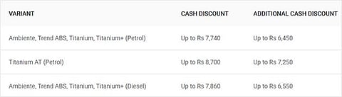 Hyundai is offering a cash discount of Rs 96,000 on the S (petrol) variant of the Xcent. Remaining variants, on the other hand, are available with benefits of upto Rs 90,000. Additionally, Hyundai is also offering free 3-year/1 lakh km warranty with RSA on all variants of the Xcent.