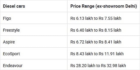 Prices of the current Ford diesels range between Rs 6.13 lakh and Rs 32.98 lakh.