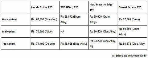 Honda has launched the next-generation Activa 125, which is not only India’s first BS6 compliant two-wheeler, but also gets many useful features like an external fuel filler cap and a semi-digital instrument console that shows real-time fuel efficiency. The new Activa 125 goes up against the recently launched Hero Maestro Edge 125 and the best-seller in the segment, the Suzuki Access 125. We have included the TVS NTorq 125 here as despite being a sporty scooter, it is priced lower than its rivals. We compare these four 125cc scooters on paper.