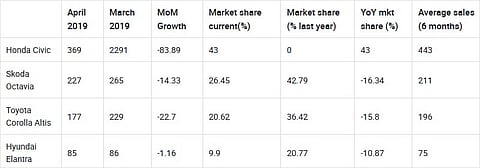 Back in March 2019, the Honda Civic re-entered the mid-size sedan segment after a gap of six years and as expected, it’s sales figures went through the roof that month. This is partly due to the legendary status the Civic enjoys in the country. However, once the initial frenzy for the Civic had died down, its sales figures fell by over 80 per cent (month-on-month). Despite that, the Civic continues to be the top-selling car in its segment by beating the Skoda Octavia by over 140 units. Here’s a detailed analysis of how cars in this segment fared in the month of April.