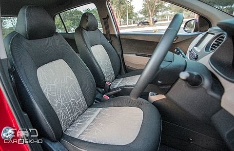 The front cabin of the Grand i10 is wider and, as a result, it’s got a wider set of seats too. But other than that, there's no real advantage that the Grand i10 has in terms of interior space for front passengers. The Santro not only offers better legroom and kneeroom for front occupants, but its seat base length is also longer, and that can result in slightly better under-thigh support. The Grand i10’s seat base height is more than the Santro’s, so you sit more upright. This fact is a little surprising since you should ideally be sitting higher up in the Santro as it’s a taller car.