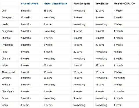 Maruti Vitara Brezza: Although the Brezza is the best selling sub-4m SUV in the country, it is readily available in cities like Gurugram, Bengaluru, Chennai, Kolkata and Patna. In other cities, the waiting period on the Maruti ranges from 15 days in Delhi to 45 days in Jaipur.