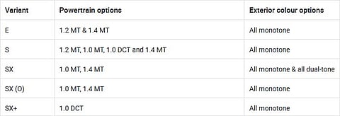 Variant-wise powertrain and exterior colour options are as follows: