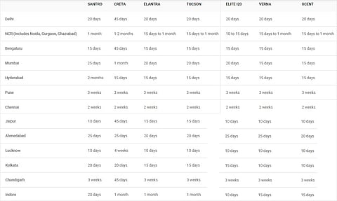 Waiting period for all the Hyundai cars range between 10 days to 2 months.