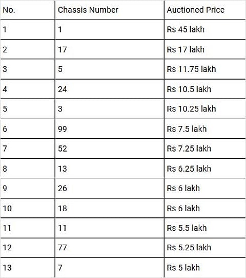 Bidders got to choose their favoured chassis number. People could bid live from the venue as well as online with an average bidding amount of Rs 10 lakh per lot bidded. The least that was bidded at the event was for chassis number 7 which went for just Rs 5 lakh. That is nearly triple the amount you pay for the regular bike. Here the list of the chassis numbers auctioned off: