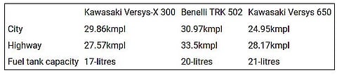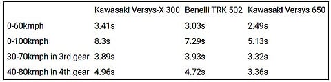 We are pleasantly surprised with the way the new Benelli TRK 502 has turned out. Not only does it look like a large capacity motorcycle, it also is a capable tourer and has the bells and whistles to go along with it. And since we are of the opinion that the bike slots in nicely between the lower displacement Kawasaki Versys offerings - the Versys-X 300 and the Versys 650 -, we ought to back it up with numbers that matter.