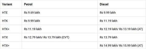 Seltos HT Line variants prices range from Rs 9.69 lakh to Rs 15.99 lakh (ex-showroom, India).