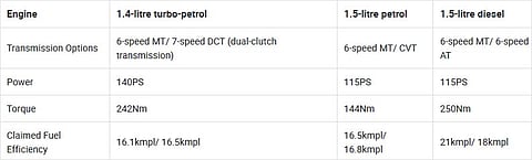 All engines paired to a 6-speed manual while the engine-wise automatic options are CVT (1.5-litre petrol), 6-speed AT (1.5-litre diesel) and 7-speed DCT (1.4-litre turbo-petrol).