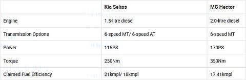 MG offers a larger diesel engine with the Hector which offers a lot more power and torque than the Seltos’ diesel unit.