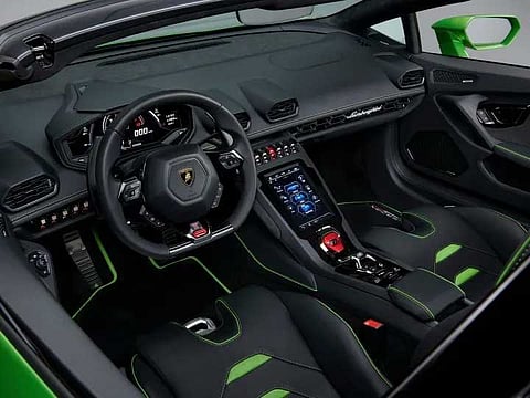 Inside, the Huracan Evo Spyder features a modern cabin that can give an aircraft cockpit a run for its money. Interesting elements include the digital driver’s display, a modern 8.4-inch touchscreen infotainment system and toggle switches for select controls including the engine start-stop button.