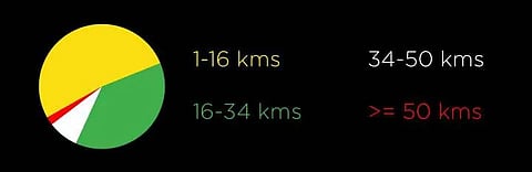Of the Ather 450’s two riding modes, Sport and Ride, nearly two-thirds of the 6,00,000 kilometres have been covered in the latter mode. This indicates that owners are not too exuberant with their riding as the Ride mode helps them cover more distance. The average daily usage statistics say that nearly 90 per cent of the owners do not ride more than 34 km in a day and overall, just 50 per cent of owners ride upto 16km on a daily basis.
