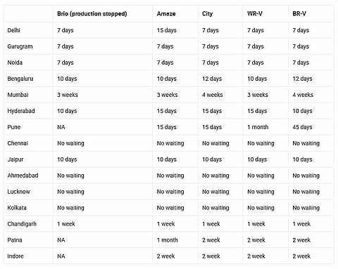Honda WR-V: The third-best selling Honda in India commands a maximum waiting period of not more than one month. Like its siblings, it is also readily available in cities like Chennai, Lucknow, Kolkata and Ahmedabad.