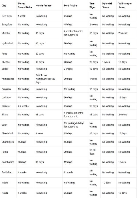 The Honda Amaze can be had without a wait in 13 cities.