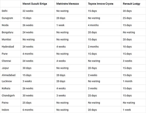 Mahindra Marazzo: The Mahindra MPV is quite easily available across the country with waiting periods of not more than 4 weeks. It is readily available even in cities like Delhi, Bengaluru, Mumbai, Pune, Jaipur, Indore and Noida.