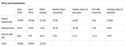 Maruti Suzuki Alto saw a nearly 28 per cent drop in MoM (month-on-month) demand in May 2019.