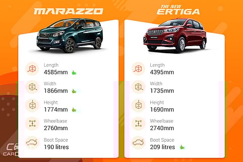 The Mahindra Marazzo is longer, wider and taller than the Maruti Suzuki Ertiga by a substantial margin. The wheelbase too is longer, but the difference is not as big as other measurements. The Ertiga, however, offers more boot space with the third row folded up.