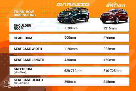 The headroom offered in the third row of the Marazzo is 30mm more. But the Ertiga’s third row seat is positioned higher than the Marazzo’s by 55mm, giving passengers a better seating position overall. The seat base length is also more in the Ertiga, offering better under thigh support.