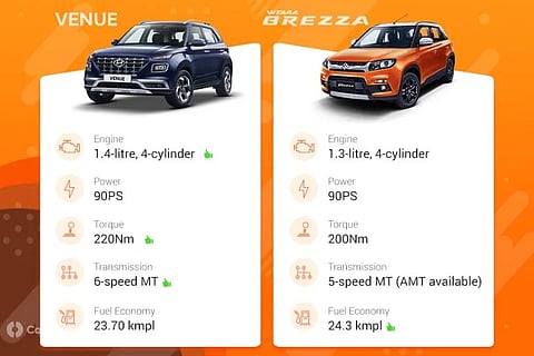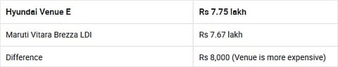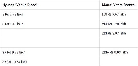 Hyundai has launched the Venue with prices ranging between Rs 6.50 lakh and Rs 11.10 lakh (ex-showroom Delhi). It is available in a choice of five variants (E, S, SX, SX+, SX(O)) and three engine options -- one diesel and two petrol engines. If you are eyeing a diesel-powered Hyundai Venue you might want to compare it against the Maruti Suzuki Vitara Brezza to find out whether it offers more value than the Suzuki or not. So we place the Maruti SUV against the new Hyundai to find out which one offers better value for your money variant-by-variant.