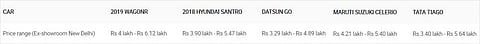 Let’s see how the WagonR’s expected pricing compares against the actual prices of its rivals.