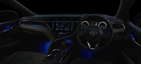 Inside, you find an all-new cabin worthy of being in a Toyota flagship. The centre tunnel gets a 'Y'-shaped casing which holds the 8-inch touchscreen infotainment system which is connected to a 9-speaker JBL Dolby audio system. The ambient lighting runs along the dashboard crease and there is also use of a wooden trim to keep up the typical Camry charm. Other features include memory function for driver’s seat, rear armrest with a capacitive touch screen, 3-zone climate control, a leather-wrapped steering wheel with audio controls and cruise control and wireless charging.