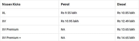 The Nissan Kicks is priced between Rs 9.55 lakh and Rs 14.65 lakh (ex-showroom India).
