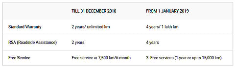- Starting 1 January 2019, all Volkswagen cars will be available with a total of four years of roadside assistance along with standard vehicle warranty for 4 years/1 lakh km.