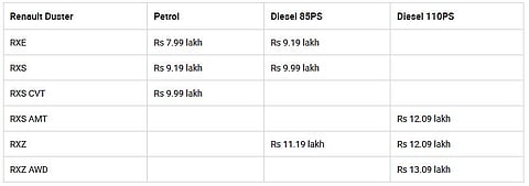- Mid-spec Duster RXL petrol and top-spec Duster RXZ diesel AMT discontinued; variant lineup drops to three (RXE, RXS and RXZ).