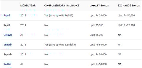 Apart from the Rapid and the MY2018 Superb, all other cars are available with loyalty bonus only. The MY2018 Rapid and Superb can be had with free insurance, the amount for which can range up to around Rs 76,000 for the Rapid and over Rs 1.5 lakh for the Superb.