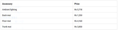 Interior accessories include ambient lighting, floor mat, dash mat and trunk mat.