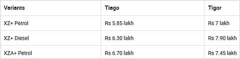 The Tiago and Tigor XZ+ variants are feature rich offerings with goodies such as auto climate control, 15-inch alloy wheels, 7-inch infotainment system with Apple CarPlay and Android Auto, and projector headlamps.