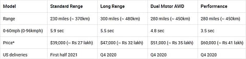 Tesla has announced that the Model Y will have a real-world range of up to 300 miles (~ 480km). The carmaker is yet to reveal battery capacity (kWh) of the Tesla Model Y. Here’s the variant lineup, range (real world) and US prices of the mid-size SUV.