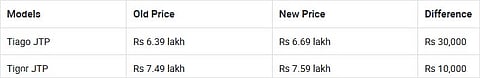 Tiago JTP is more expensive by Rs 30,000 while Tigor JTP’s price has gone up by Rs 10,000.