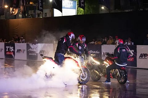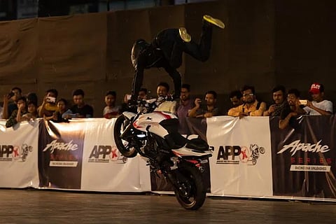 So imagine my surprise when TVS decided to get into the Asia Book of Records by organising a non-stop stunt show for 6 hours straight. Yes, you read that right. A total of five teams performed eyebrow-raising acrobatics on moving Apache RTR 200 4Vs in front of 25,000 people yesterday in Pune!
