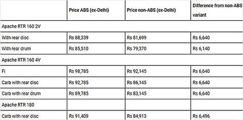 Lastly, the Apache RTR 160 Fi ABS, RTR 160 carb with rear disc and the RTR 160 carb with rear drum brake have also been updated with single-channel ABS. They now command a premium of Rs 6,640 over the non-ABS variants that are set to be discontinued soon.