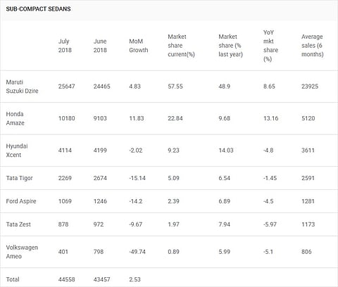 The sales report for the month of July 2018 is out and, as usual, the results are predictable in the sub-compact sedan segment. The Dzire is still the top car in this category with a mighty market share of over 50 per cent. As was the case in June 2018, the new Amaze has taken up the second spot with grace as it found over 10,000 new homes. Here’s how each car in this category fared on the sales chart in July: